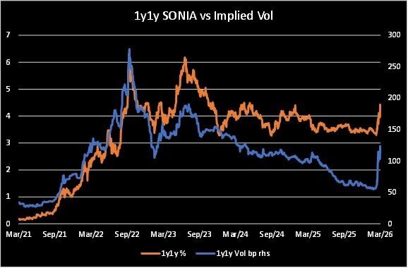 On February 27th the market was pricing 50bp of interest rate cuts to 3.25% by the November 5th meeting, but at close of business last night the market was pricing 65bp of hikes, a 115bp round trip! The options market was pricing just above 50bp of annualised volatility for 1- to 2-year SONIA rates, so we have seen realised volatility over 3x the annual implied in the space of three weeks. The 1-year inflation swap has increased by 190bp or 1.9% over the same period, implying a YoY CPI rate of 4.25% to December 2026. The 5-year inflation swap has increased by just over 60bp, primarily reflecting the1-year rise, suggesting that longer-term inflation expectations are not yet becoming unmoored.